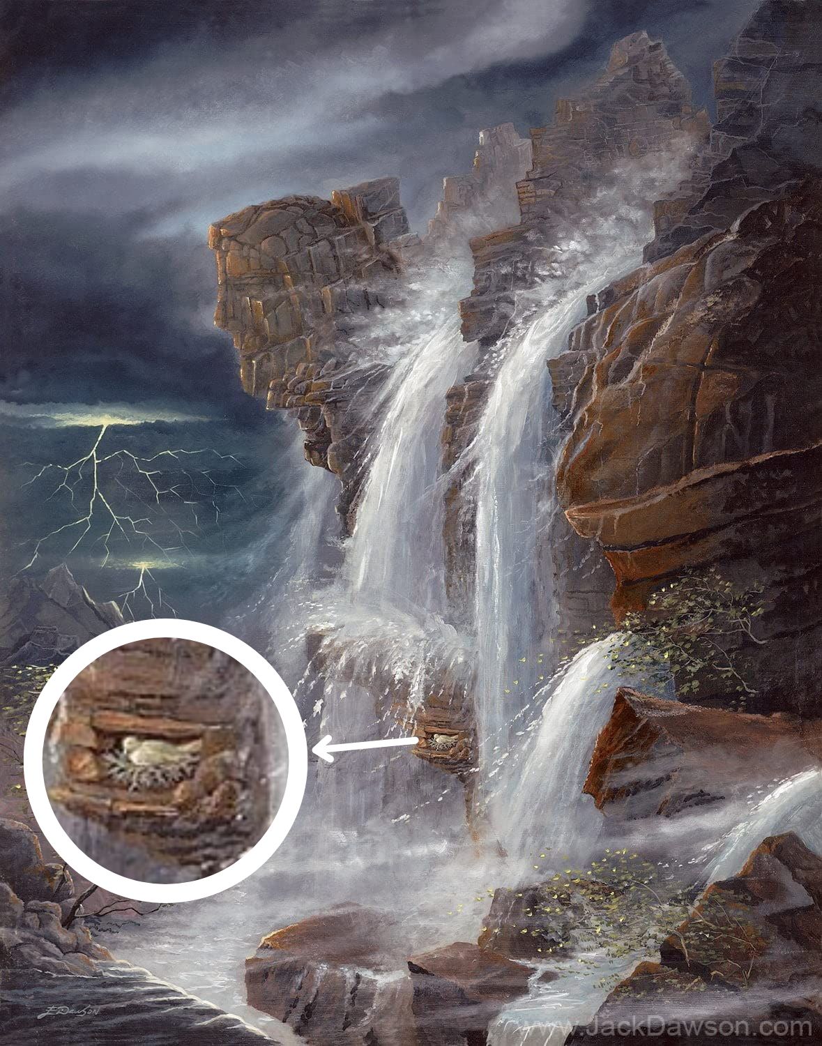 ஆனால் ராஜா அதை உற்றுப் பார்த்தபோது, அவர் ஏதோ ஒரு விஷயத்தைக் கவனித்தார் - நீர்வீழ்ச்சிக்குப் பின்னால், ஒரு சிறிய பாறைப் பிளவில் ஒரு தாய்ப் பறவை அதன் கூட்டில் அமைதியாகவும், எவ்வித தொந்தரவில்லாமலும் அமர்ந்திருந்தது.
