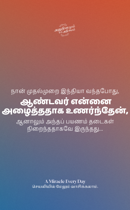 நான் முதன்முதலில் இந்தியா வந்தபோது எனக்கு ஏற்பட்ட அனுபவம் நினைவுக்கு வருகிறது. தேவன் என்னை அழைத்திருப்பதை நான் உணர்ந்தேன், ஆனாலும் அந்தப் பயணம் தடைகள் நிறைந்ததாகவே இருந்தது. என்னை அனைவரும் நேசித்து, கொண்டாடிய ஒரு ஊழியத்தை என் சொந்த நாட்டில் விட்டுவிட்டு, எனக்கு யாரையுமே தெரியாத, எல்லாவற்றையும் ஆரம்பத்திலிருந்து தொடங்க வேண்டிய ஒரு நாட்டிற்கு சேவை செய்ய நான் வந்தேன்.